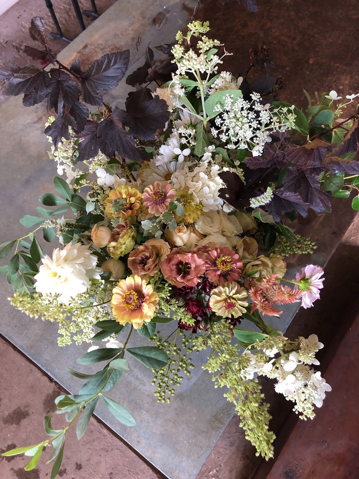 Privet berry, heuchera bloom, quickfire hydrangea, Ninebark foliage, baptisia foliage, celosia, and Queen Anne’s lace contrast the layered clusters in the interior of the bouquet, creating a collar of airy-ness.