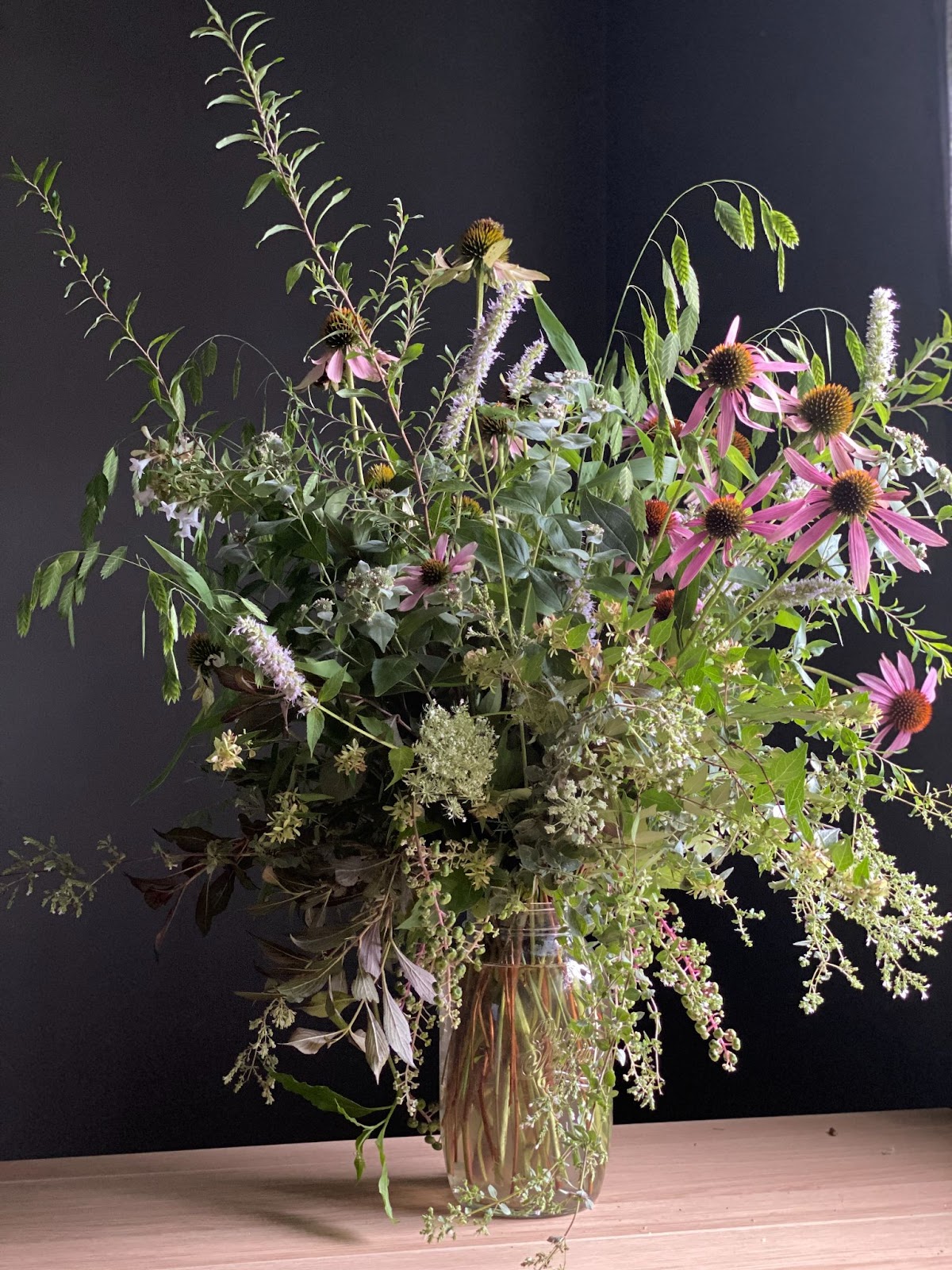 Texture is also a beautiful and cost effective way to add body and fullness to a design. The design below skips any prominent mass bloom to create fullness and rather focuses on a range of late summer textures like grasses, fillers and foliages. The arrangement feels full and engaging because of the commingling textures. These textures also highlight the comparatively smooth petals of the echinacea, allowing them to pop and create a larger presence, albeit just having a few stems.